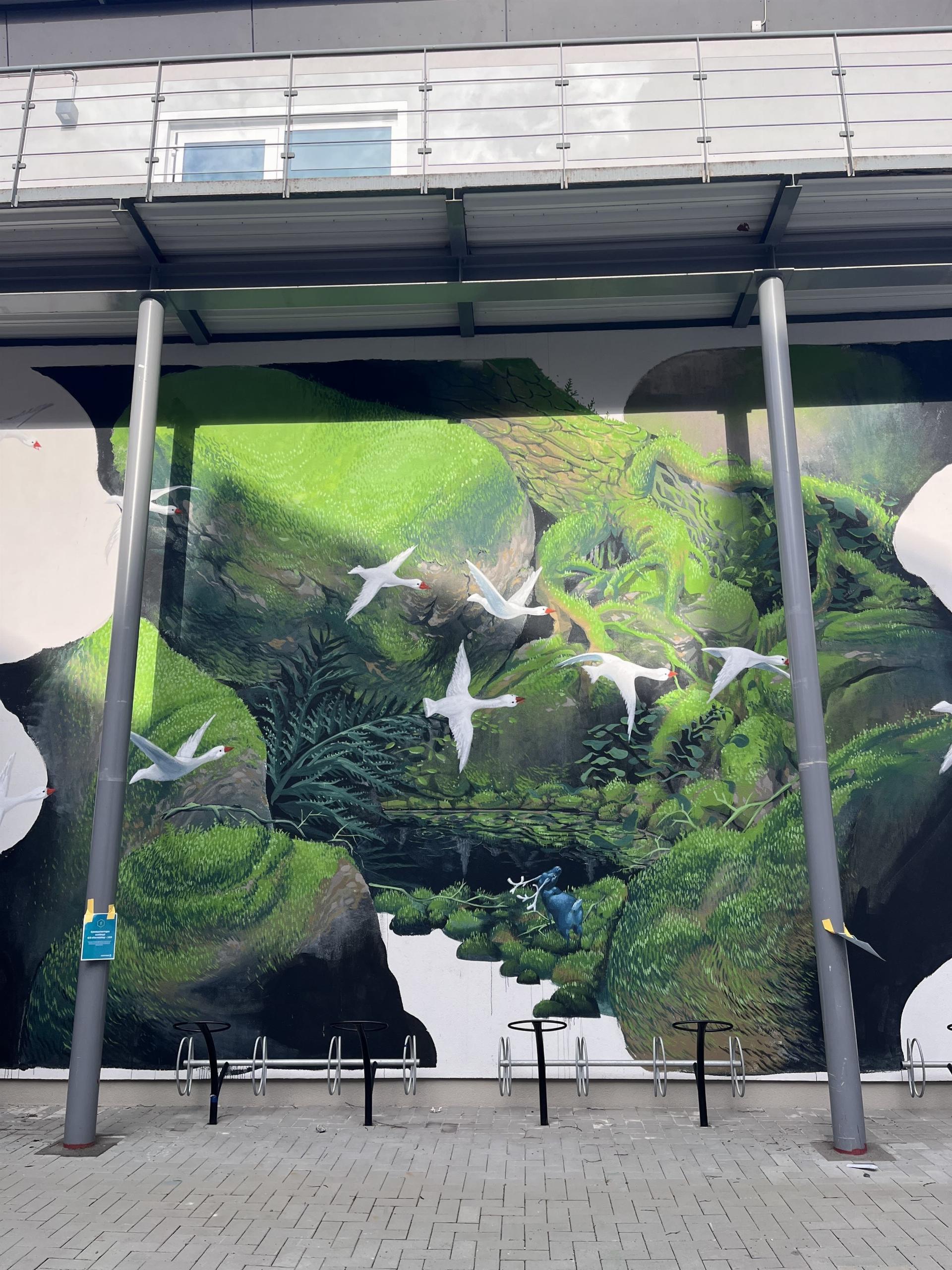 Muralmålningen döptes till ”Urskog” och är inspirerad av naturen och en resa som påverkade konstnären mycket. Målningen kan ses på Fridtunagatan 33 (från Wahlbecksgatan 20) och komer bli en uppskattad grön färgklick i bostadsområdet i Linköping.